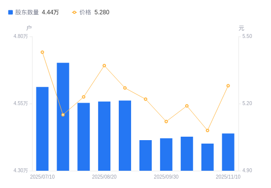 近一年(2024年11月20日至2025年11月10日),华锦股份A股股东户数从4.69万户,减低至4.44万户,降幅5.43%,区间股价下跌1.90%。