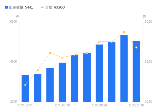近一年(2024年12月31日至2025年11月10日),国力电子A股股东户数从3910户,增加至5441户,增幅39.16%,区间股价上涨53.43%。