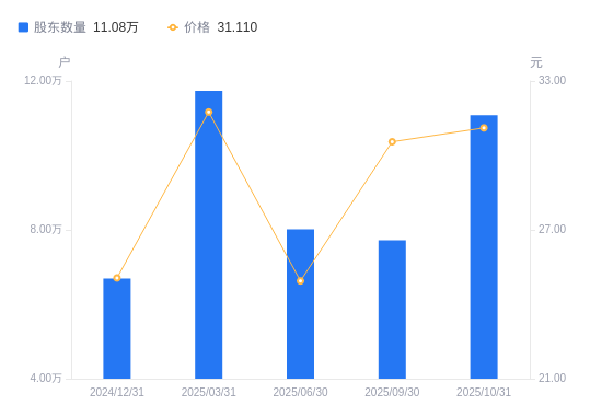 近一年(2024年12月31日至2025年10月31日),至纯科技A股股东户数从6.69万户,增加至11.08万户,增幅65.57%,区间股价上涨18.15%。