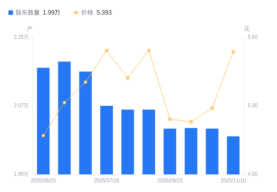 近一年(2024年11月20日至2025年11月10日),永清环保A股股东户数从2.19万户,减低至1.99万户,降幅9.13%,区间股价上涨5.68%。