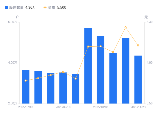 近一年(2024年12月10日至2025年11月20日),易成新能A股股东户数从4.28万户,增加至4.36万户,增幅1.70%,区间股价上涨7.21%。
