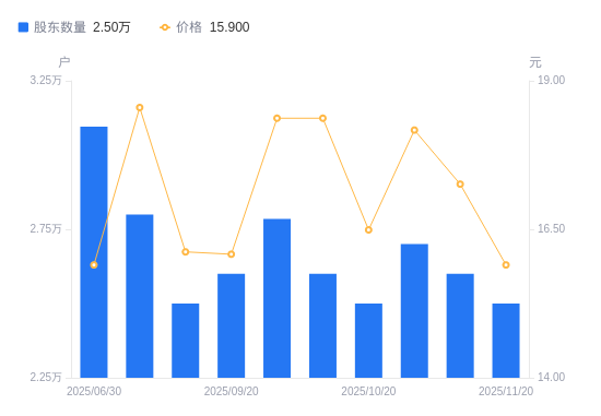 近一年(2024年12月31日至2025年11月20日),光力科技A股股东户数从2.05万户,增加至2.5万户,增幅22.15%,区间股价上涨18.22%。