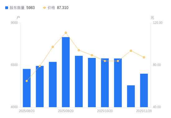 近一年(2024年11月20日至2025年11月20日),凯迪股份A股股东户数从7880户,减低至5983户,降幅24.07%,区间股价上涨158.43%。