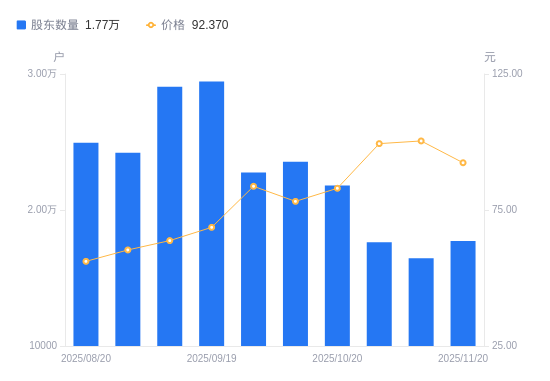 近一年(2024年11月20日至2025年11月20日),尚太科技A股股东户数从1.55万户,增加至1.77万户,增幅14.02%,区间股价上涨27.14%。