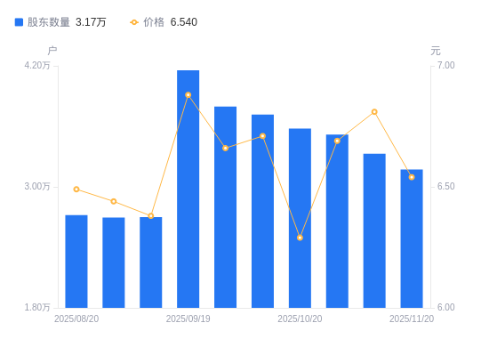 近一年(2024年12月20日至2025年11月20日),中汽股份A股股东户数从3.37万户,减低至3.17万户,降幅5.98%,区间股价上涨3.19%。