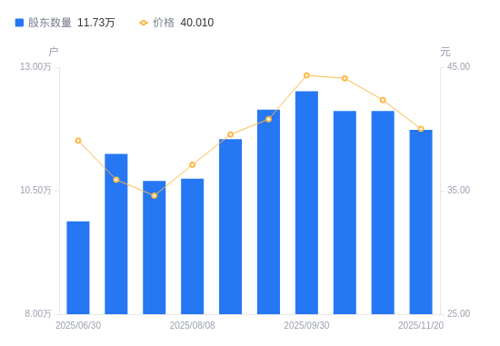 11月21日消息,数据显示,截至2025年11月20日,成飞集成A股股东总户数为11.73万户,较上期(2025年10月31日)减少3815户,降幅3.15%。公司最新A股总股本为3.59亿股,其中流通A股3.59亿股,户均持有流通A股数量为3057.41股,较上期增加96.28股,增幅3.25%;户均持流通A股市值12.23万元,较上期减少3047.24元,降幅2.43%。