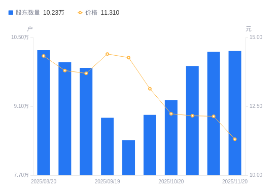 近一年(2024年12月20日至2025年11月20日),神州泰岳A股股东户数从10.53万户,减低至10.23万户,降幅2.87%,区间股价下跌9.52%。