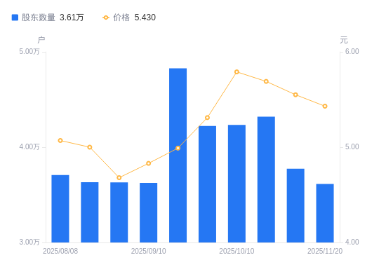 近一年(2024年11月29日至2025年11月20日),德尔未来A股股东户数从4.51万户,减低至3.61万户,降幅19.78%,区间股价上涨2.26%。