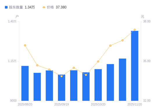 近一年(2024年11月20日至2025年11月20日),快可电子A股股东户数从1.24万户,增加至1.34万户,增幅8.21%,区间股价下跌2.22%。