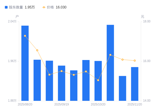近一年(2024年11月20日至2025年11月20日),必创科技A股股东户数从2.04万户,减低至1.95万户,降幅4.38%,区间股价下跌17.79%。