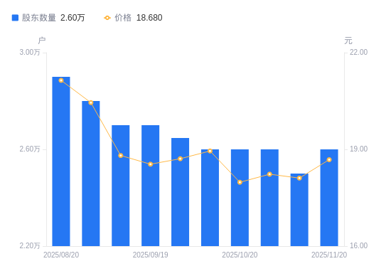 近一年(2024年11月20日至2025年11月20日),会畅通讯A股股东户数从3万户,减低至2.6万户,降幅13.33%,区间股价下跌13.04%。