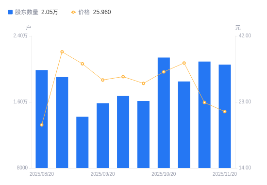 近一年(2024年11月29日至2025年11月20日),通合科技A股股东户数从1.93万户,增加至2.05万户,增幅6.60%,区间股价上涨60.82%。