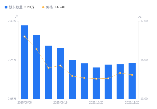 近一年(2024年12月20日至2025年11月20日),天邑股份A股股东户数从2.9万户,减低至2.23万户,降幅23.25%,区间股价下跌21.72%。