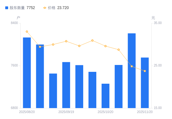 近一年(2024年12月31日至2025年11月20日),山科智能A股股东户数从8255户,减低至7752户,降幅6.09%,区间股价上涨30.24%。