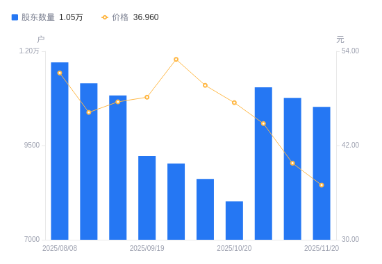 近一年(2024年11月20日至2025年11月20日),信邦智能A股股东户数从1.17万户,减低至1.05万户,降幅9.98%,区间股价上涨40.21%。