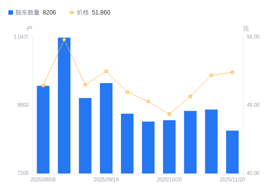 近一年(2024年11月20日至2025年11月20日),华塑科技A股股东户数从8151户,增加至8206户,增幅0.67%,区间股价上涨32.94%。