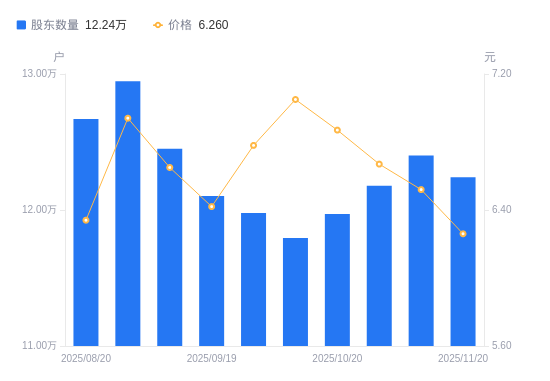 近一年(2024年11月20日至2025年11月20日),中色股份A股股东户数从11万户,增加至12.24万户,增幅11.29%,区间股价上涨23.13%。