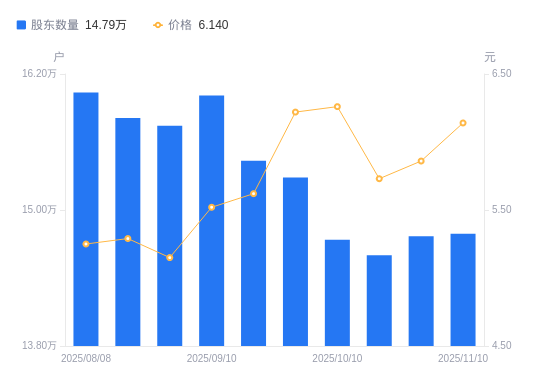 近一年(2024年11月20日至2025年11月20日),吉电股份A股股东户数从17.57万户,减低至16.53万户,降幅5.90%,区间股价上涨0.28%。