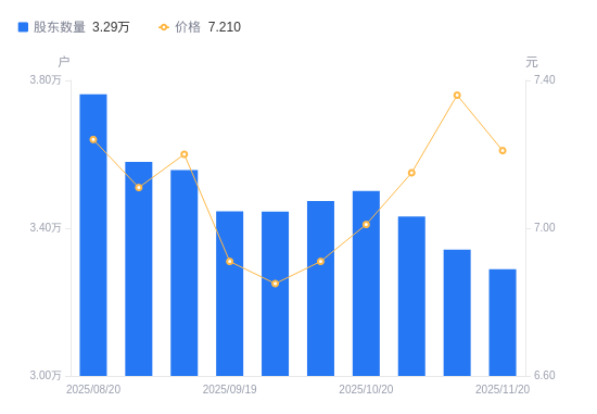 近一年(2024年11月20日至2025年11月20日),金陵药业A股股东户数从3.66万户,减低至3.29万户,降幅10.08%,区间股价上涨7.45%。