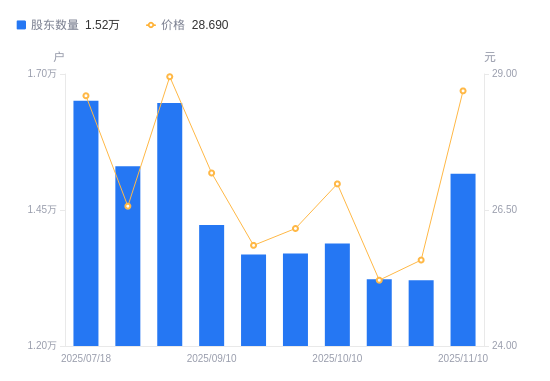 11月21日消息,数据显示,截至2025年11月20日,江天化学A股股东总户数为1.47万户,较上期(2025年11月10日)减少424户,降幅2.80%。公司最新A股总股本为1.44亿股,其中流通A股1.41亿股,户均持有流通A股数量为9556.33股,较上期增加267.15股,增幅2.88%;户均持流通A股市值26.35万元,较上期减少3038.52元,降幅1.14%。