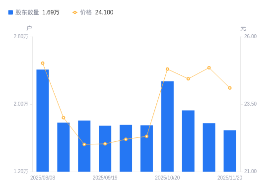 近一年(2024年11月20日至2025年11月20日),彩虹集团A股股东户数从2.06万户,减低至1.69万户,降幅18.06%,区间股价上涨17.85%。