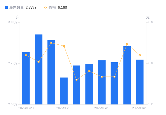 近一年(2024年11月20日至2025年11月20日),海翔药业A股股东户数从2.89万户,减低至2.77万户,降幅4.07%,区间股价上涨4.23%。
