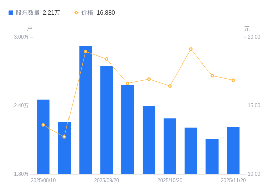 近一年(2024年11月20日至2025年11月20日),科新机电A股股东户数从2.08万户,增加至2.21万户,增幅6.47%,区间股价上涨41.82%。