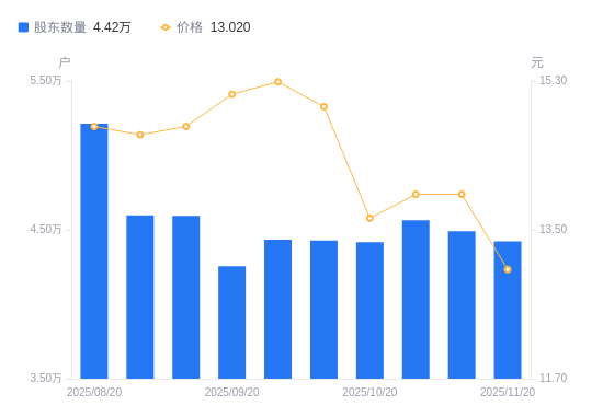 近一年(2024年11月20日至2025年11月20日),万安科技A股股东户数从5.62万户,减低至4.42万户,降幅21.35%,区间股价下跌10.64%。