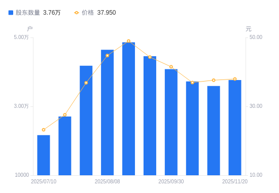 近一年(2024年12月20日至2025年11月20日),阿石创A股股东户数从2.49万户,增加至3.76万户,增幅51.39%,区间股价上涨41.76%。