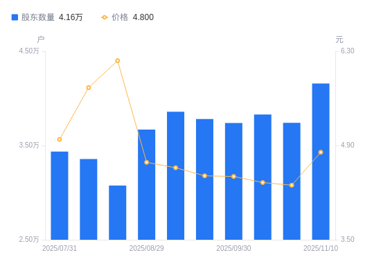 近一年(2024年11月8日至2025年10月20日),金冠股份A股股东户数从3.83万户,增加至3.83万户,增幅0.07%,区间股价下跌12.30%。