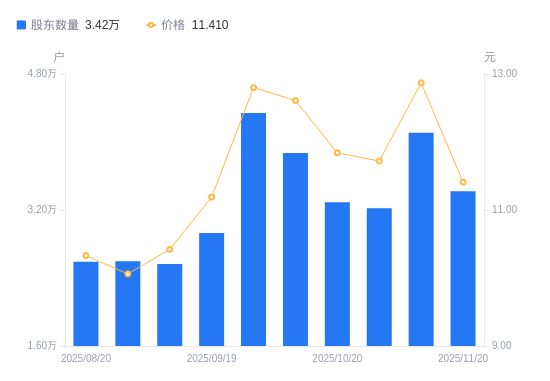 近一年(2024年11月20日至2025年11月20日),东华科技A股股东户数从4.48万户,减低至3.42万户,降幅23.66%,区间股价上涨4.11%。