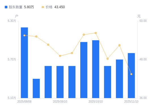 近一年(2024年11月20日至2025年11月20日),鼎捷数智A股股东户数从3.8万户,增加至5.7万户,增幅50.00%,区间股价上涨61.49%。