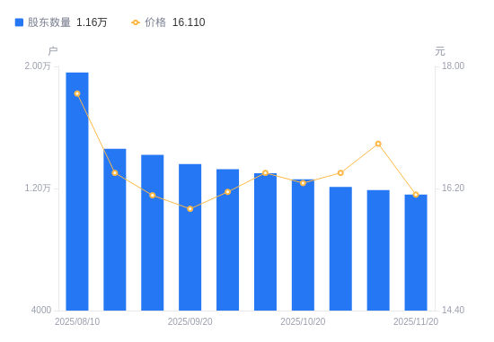 近一年(2024年11月20日至2025年11月20日),筑博设计A股股东户数从8200户,增加至1.16万户,增幅41.46%,区间股价下跌1.53%。