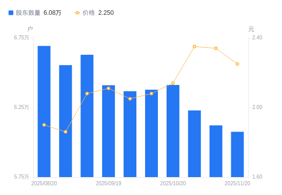 近一年(2024年12月31日至2025年11月20日),普邦股份A股股东户数从7.53万户,减低至6.08万户,降幅19.29%,区间股价上涨10.84%。