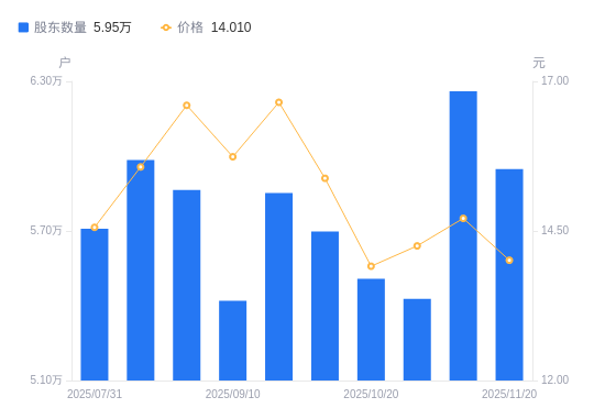 近一年(2024年11月20日至2025年11月20日),汉宇集团A股股东户数从3.19万户,增加至5.95万户,增幅86.32%,区间股价上涨59.02%。