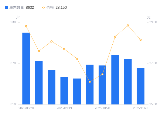 近一年(2024年11月20日至2025年11月20日),交大思诺A股股东户数从9673户,减低至8632户,降幅10.76%,区间股价上涨0.46%。
