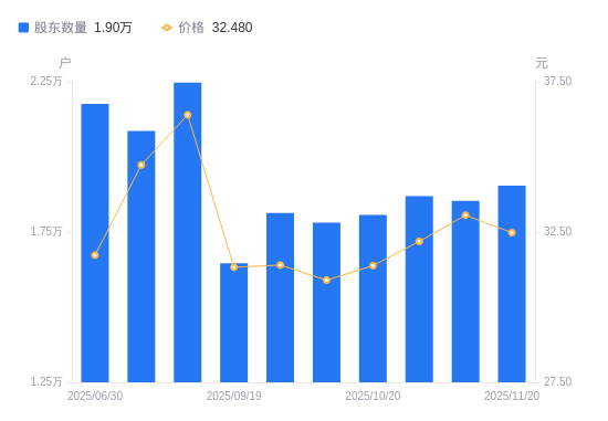 近一年(2024年11月29日至2025年11月20日),拓新药业A股股东户数从1.8万户,增加至1.9万户,增幅5.59%,区间股价上涨0.81%。