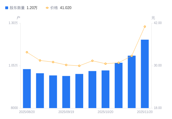近一年(2024年11月20日至2025年11月20日),争光股份A股股东户数从1.22万户,减低至1.2万户,降幅1.32%,区间股价上涨66.54%。