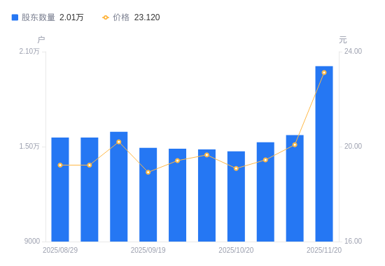 近一年(2024年11月20日至2025年11月20日),同兴科技A股股东户数从2.09万户,减低至2.01万户,降幅3.93%,区间股价上涨53.55%。