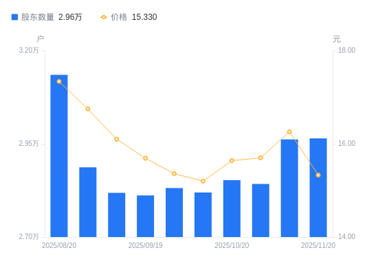 近一年(2024年11月20日至2025年11月20日),冠昊生物A股股东户数从2.9万户,增加至2.96万户,增幅2.37%,区间股价上涨15.96%。