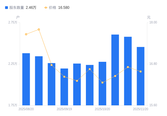 近一年(2024年11月20日至2025年11月20日),中铁装配A股股东户数从3.43万户,减低至2.46万户,降幅28.36%,区间股价下跌27.72%。