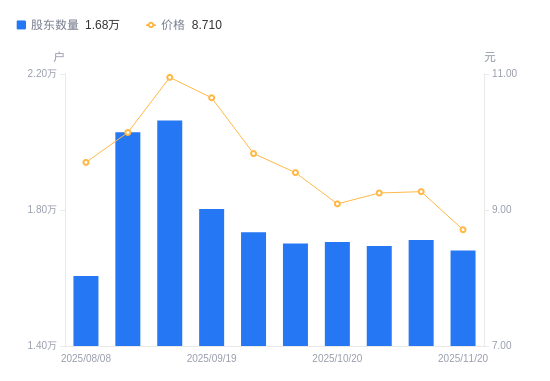 近一年(2024年11月20日至2025年11月20日),华智数媒A股股东户数从1.63万户,增加至1.68万户,增幅3.27%,区间股价下跌12.46%。