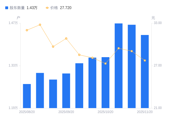 近一年(2024年11月20日至2025年11月20日),科锐国际A股股东户数从1.24万户,增加至1.43万户,增幅15.01%,区间股价上涨24.64%。
