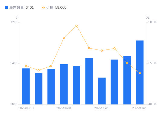 近一年(2024年12月20日至2025年11月20日),安杰思A股股东户数从5475户,增加至6401户,增幅16.91%,区间股价下跌2.00%。