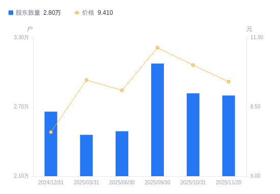 近一年(2024年12月31日至2025年11月20日),大业股份A股股东户数从2.66万户,增加至2.8万户,增幅5.29%,区间股价上涨22.05%。