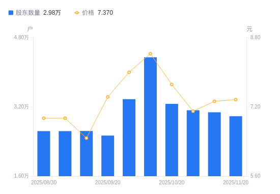 近一年(2024年12月20日至2025年11月20日),鼎信通讯A股股东户数从4.35万户,减低至2.98万户,降幅31.33%,区间股价下跌6.35%。
