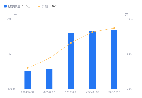 近一年(2024年12月31日至2025年10月31日),精进电动A股股东户数从1.26万户,增加至1.85万户,增幅46.87%,区间股价上涨98.01%。