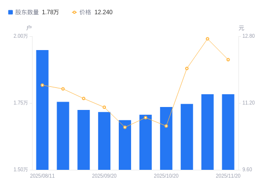 近一年(2024年11月20日至2025年11月20日),凯发电气A股股东户数从2.43万户,减低至1.78万户,降幅26.75%,区间股价上涨3.81%。