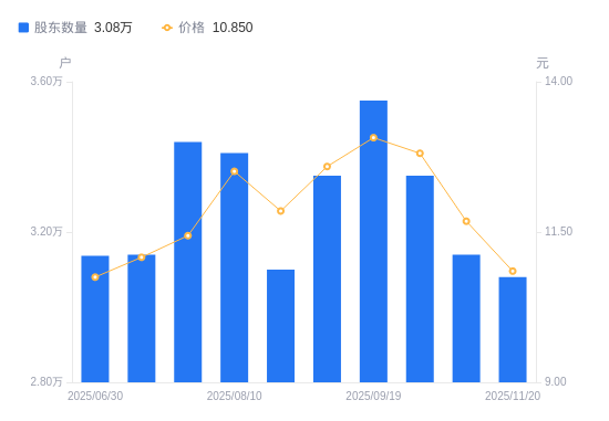 11月24日消息,数据显示,截至2025年11月20日,朗科智能A股股东总户数为3.08万户,较上期(2025年11月10日)减少600户,降幅1.91%。公司最新A股总股本为3.06亿股,其中流通A股2.5亿股,户均持有流通A股数量为8123.34股,较上期增加155.22股,增幅1.95%;户均持流通A股市值8.81万元,较上期减少4929.37元,降幅5.30%。