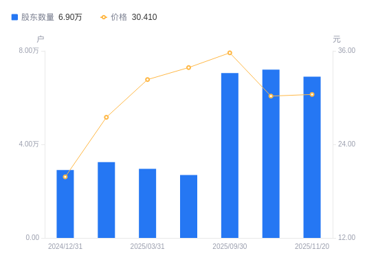近一年(2024年12月31日至2025年11月20日),禾望电气A股股东户数从2.91万户,增加至6.9万户,增幅137.44%,区间股价上涨45.99%。